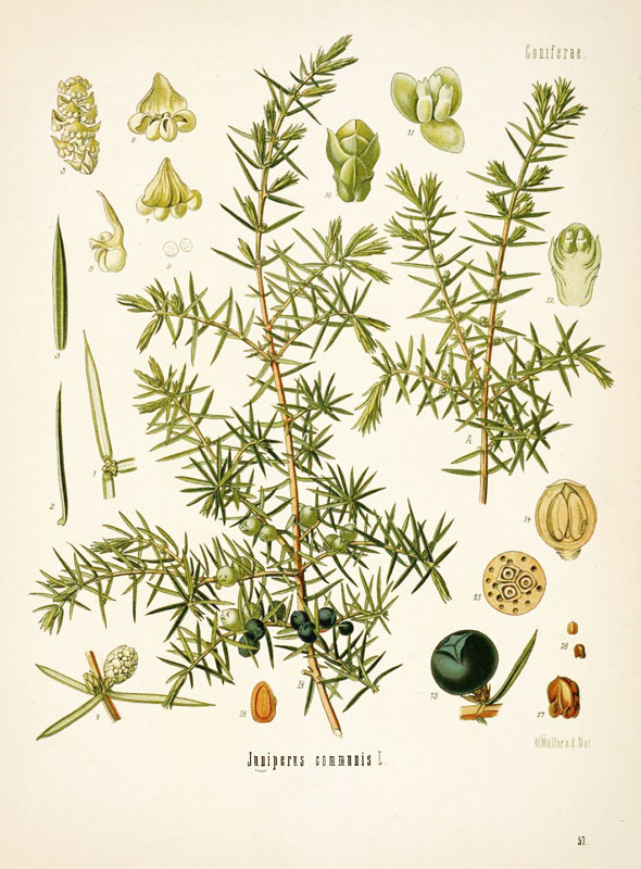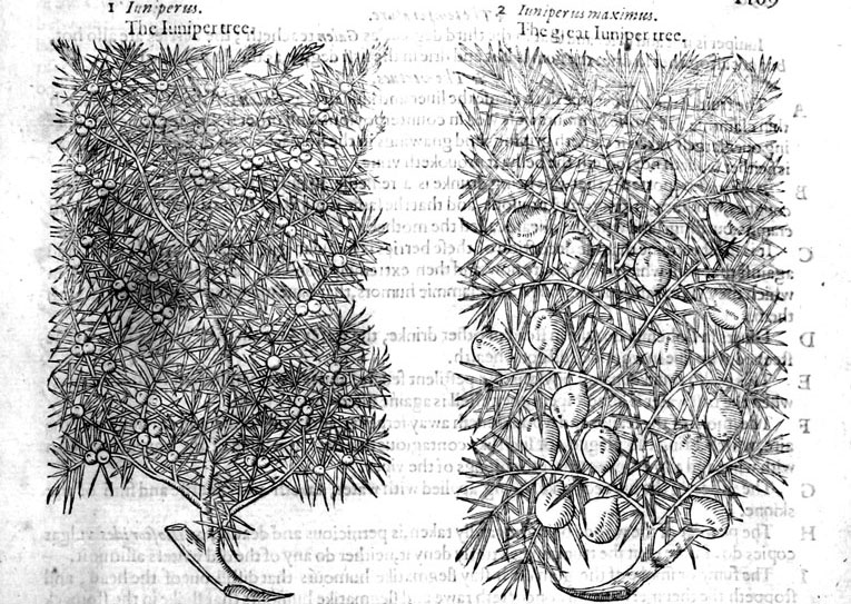[englanti juniper, red cedar · saksa Wacholder; wechholder (Gerarde 1597) · hollanti jeneverbes · ranska geneure · italia ginebro (Gerarde 1597) · espanja enebro, ginebro, zimbro (Gerarde 1597) · arabia arconas, archencas (Gerarde 1597)]